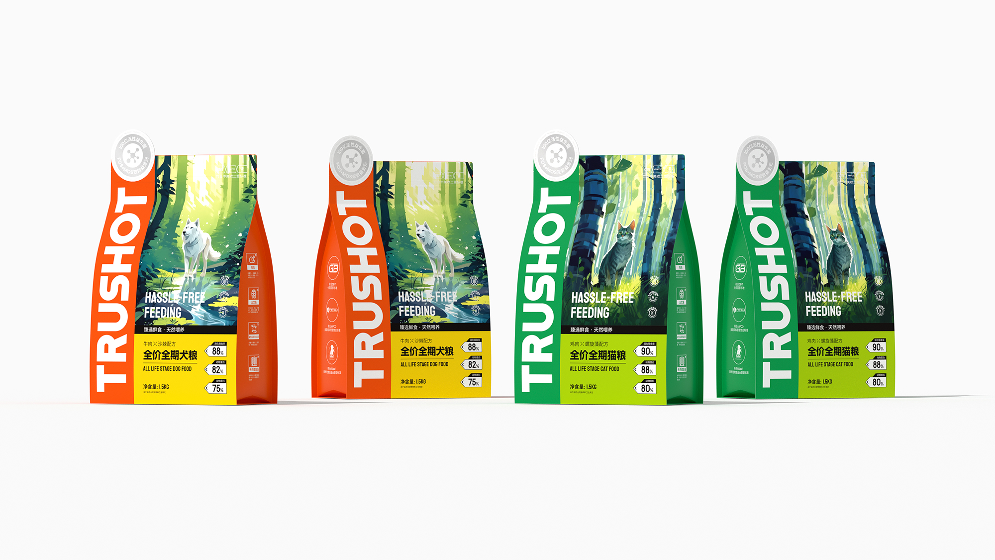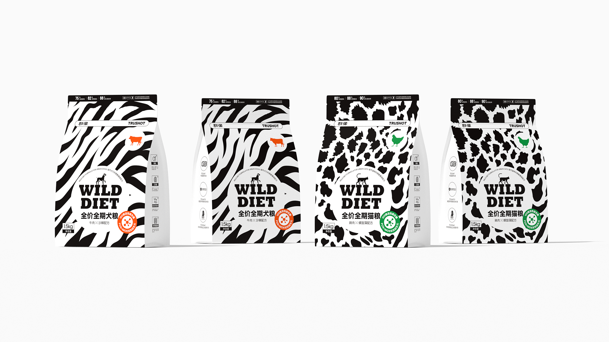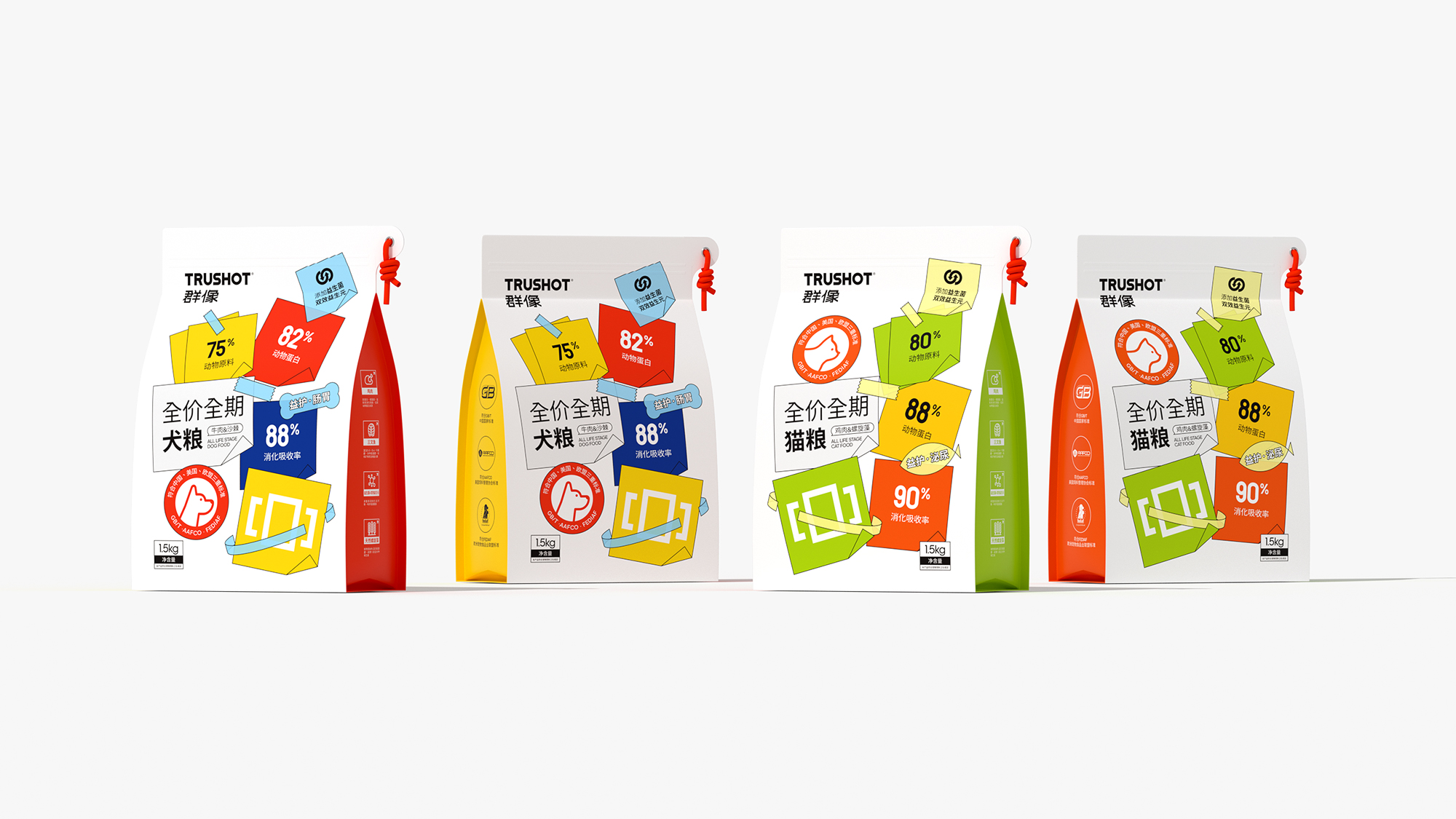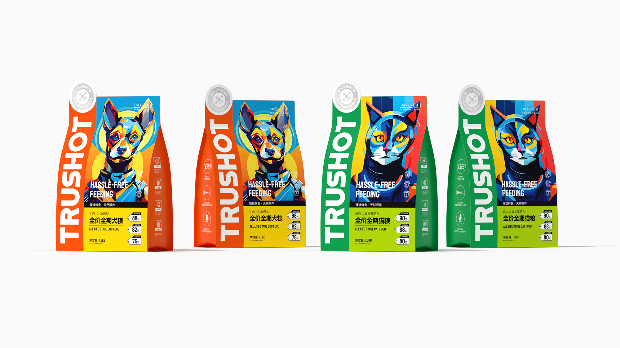 系列整体设计弱化传统动物形象,转而通过抽象几何符号构建品牌视觉资产,既保持专业食品包装的功能性和科学喂养的专业调性,又以开放式的设计语言为消费者提供个性化表达空间,重新定义宠物食品包装的情感价值与时代属性。