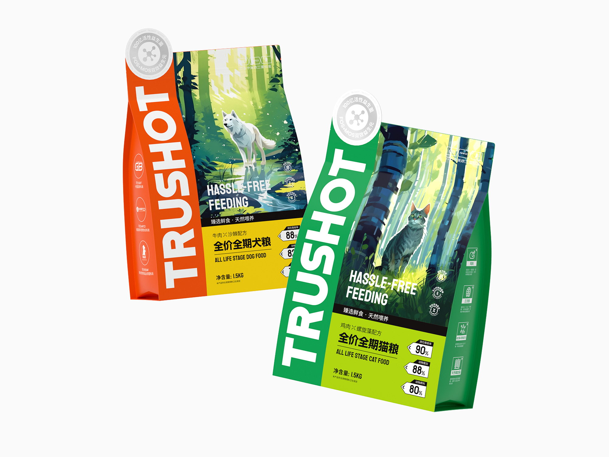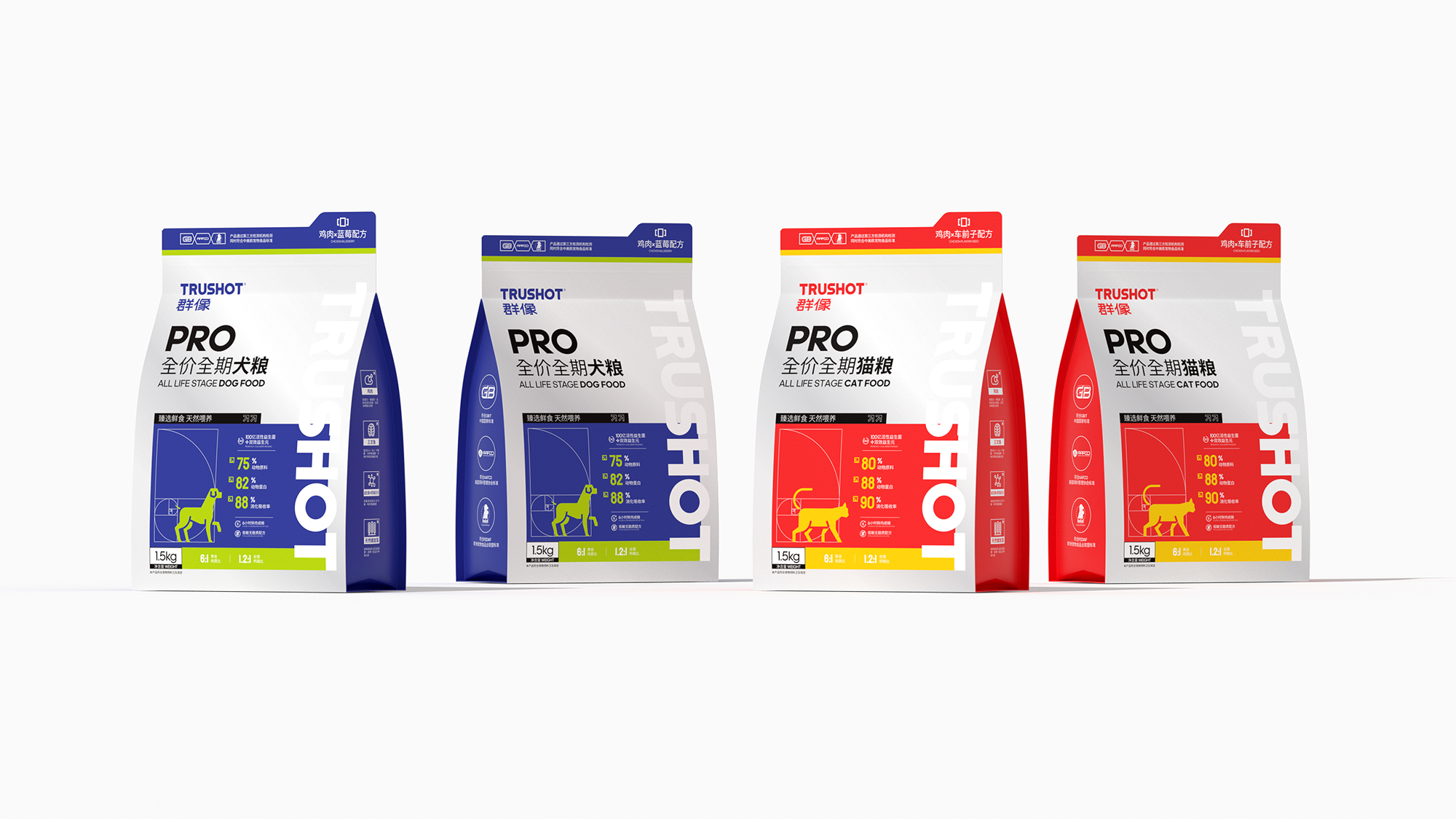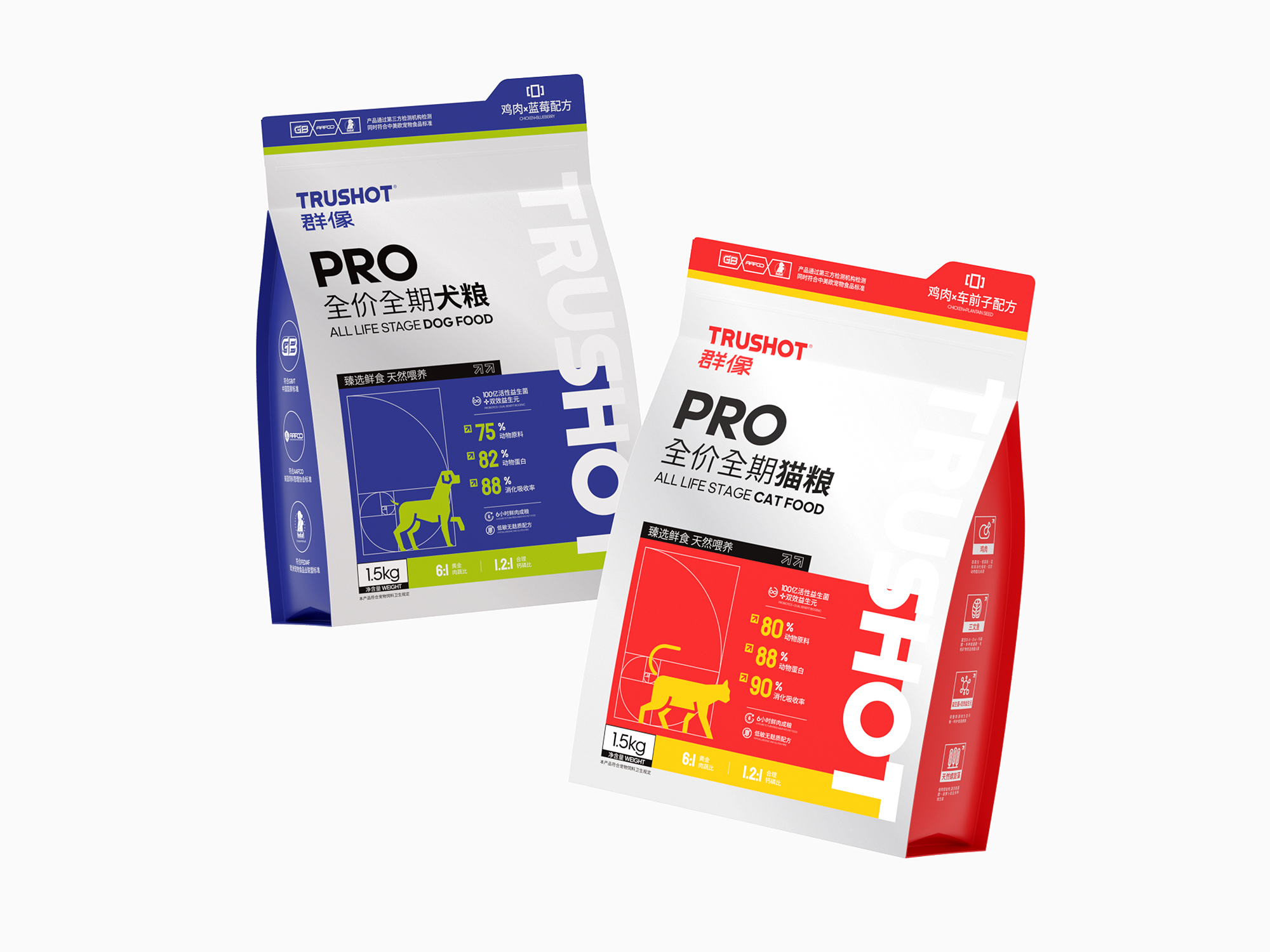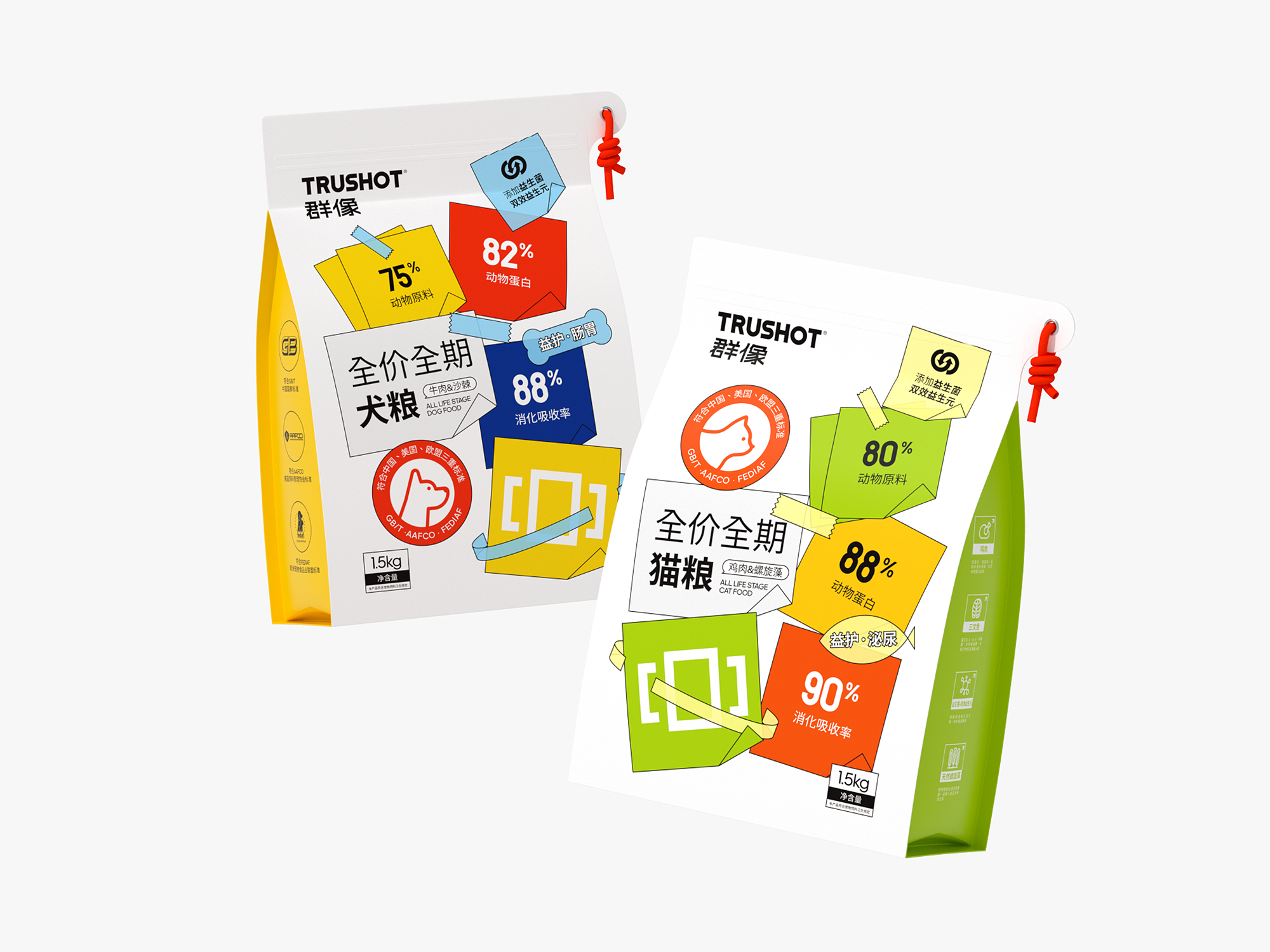 系列整体设计弱化传统动物形象,转而通过抽象几何符号构建品牌视觉资产,既保持专业食品包装的功能性和科学喂养的专业调性,又以开放式的设计语言为消费者提供个性化表达空间,重新定义宠物食品包装的情感价值与时代属性。