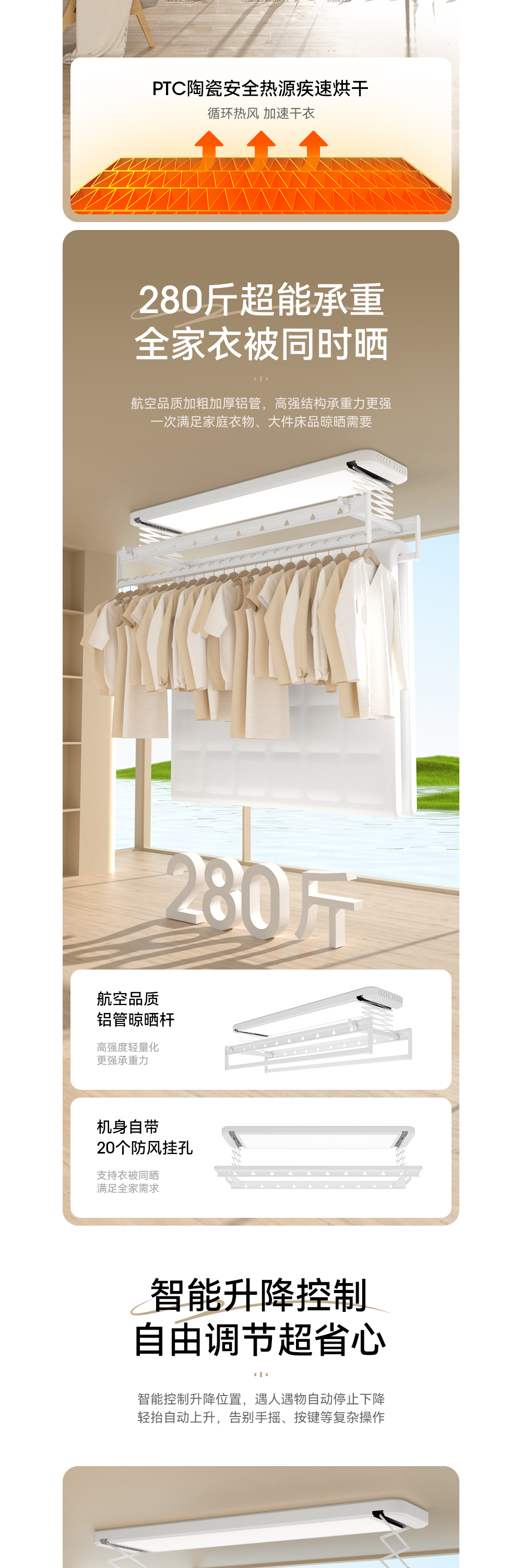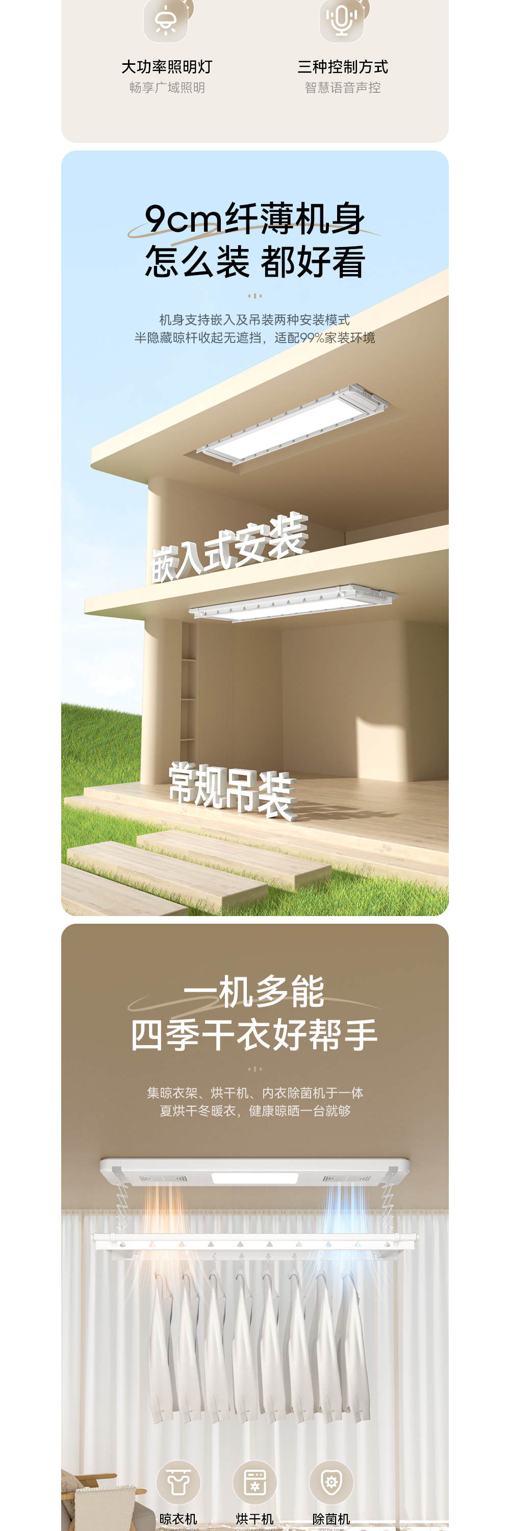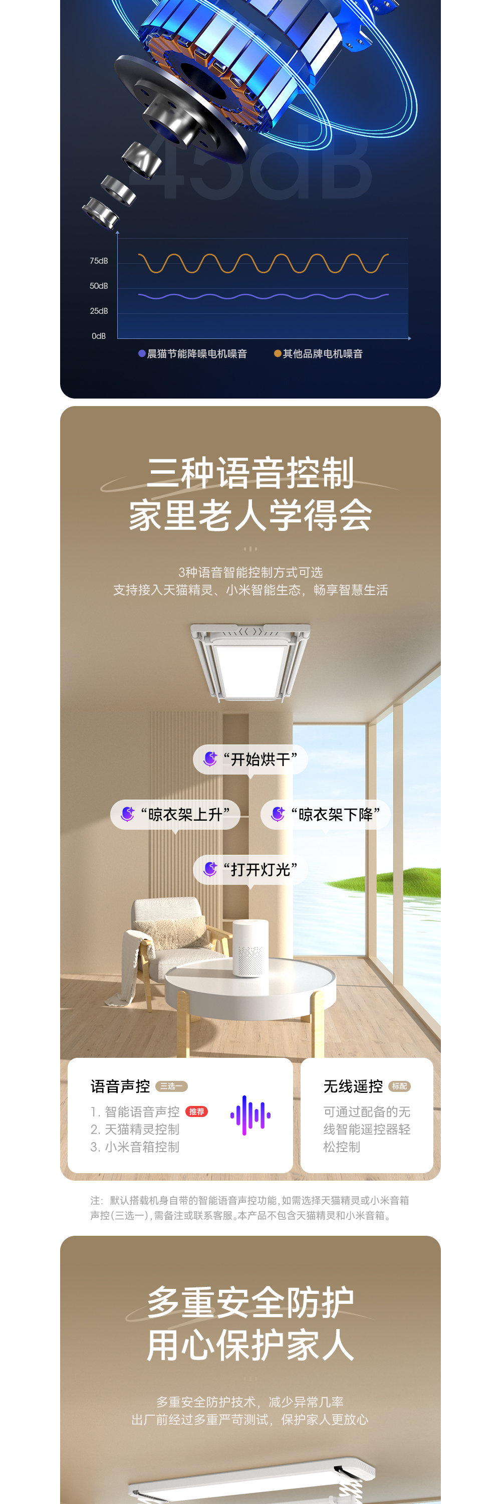 详情页中通过客厅与阳台场景的 3D 渲染图直观呈现产品安装效果,强化消费者代入感。除了各项性能的展示外,特别设置智能控制流程的 GIF 动图图解模块,兼顾专业性与生活感,让消费者对操控方式一目了然。