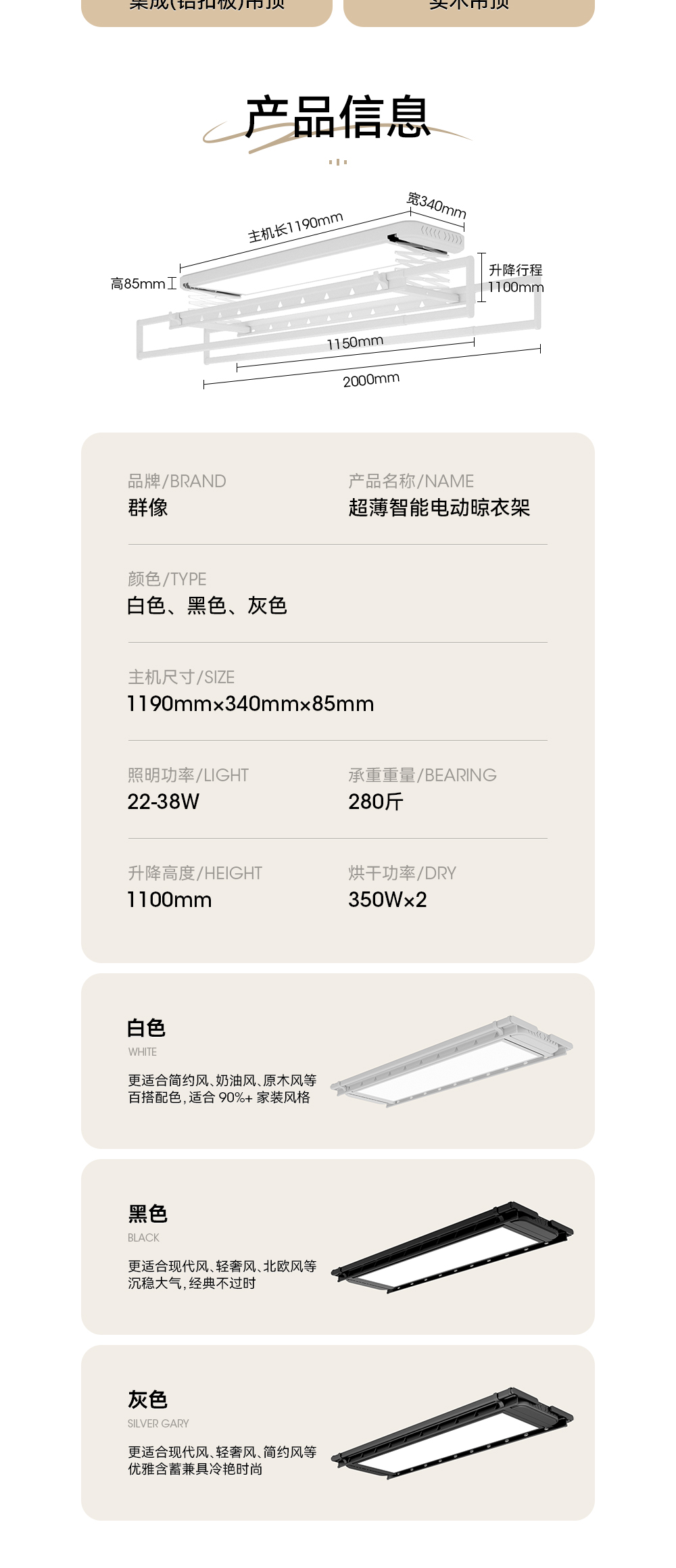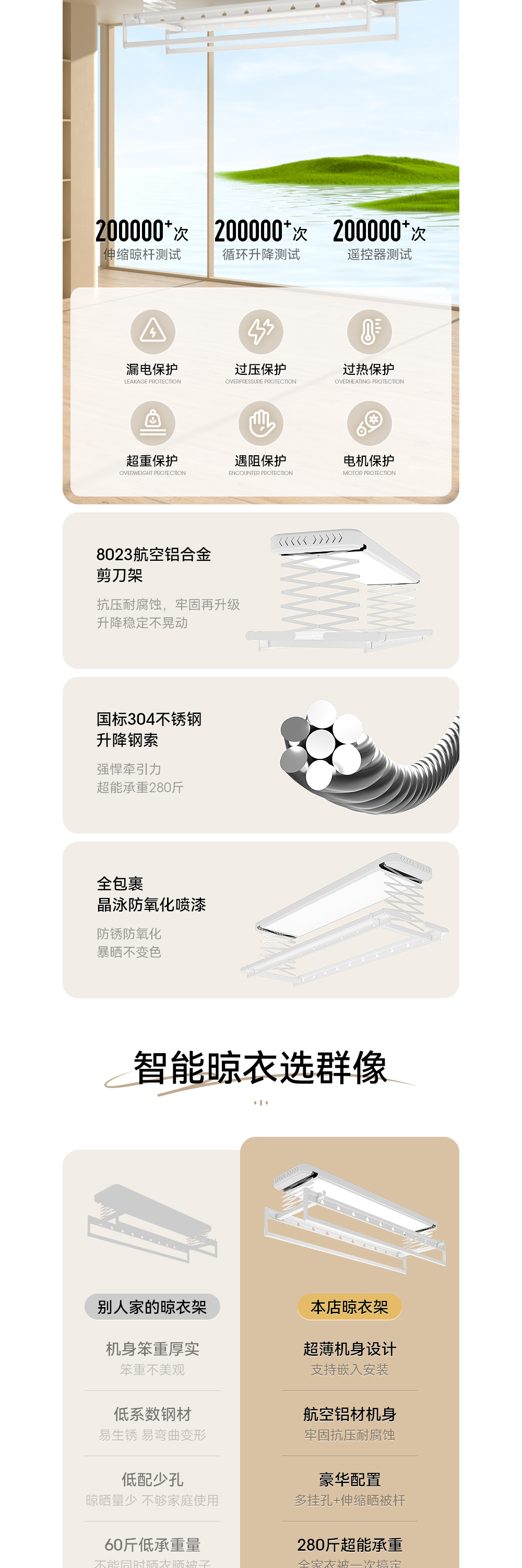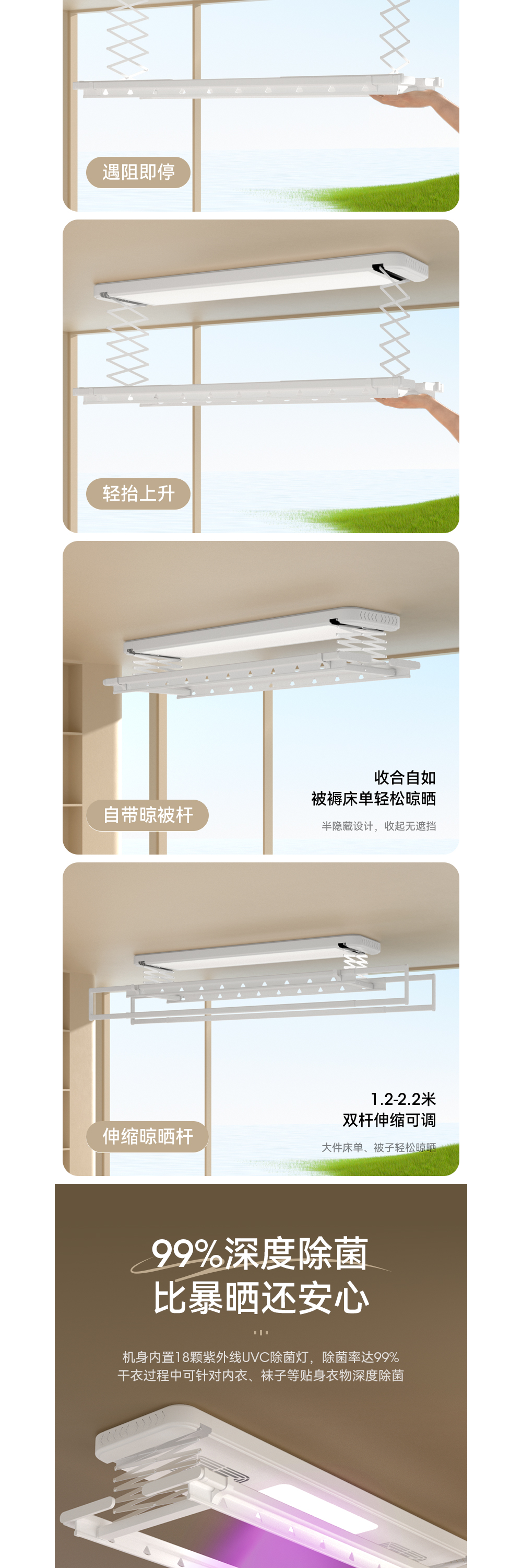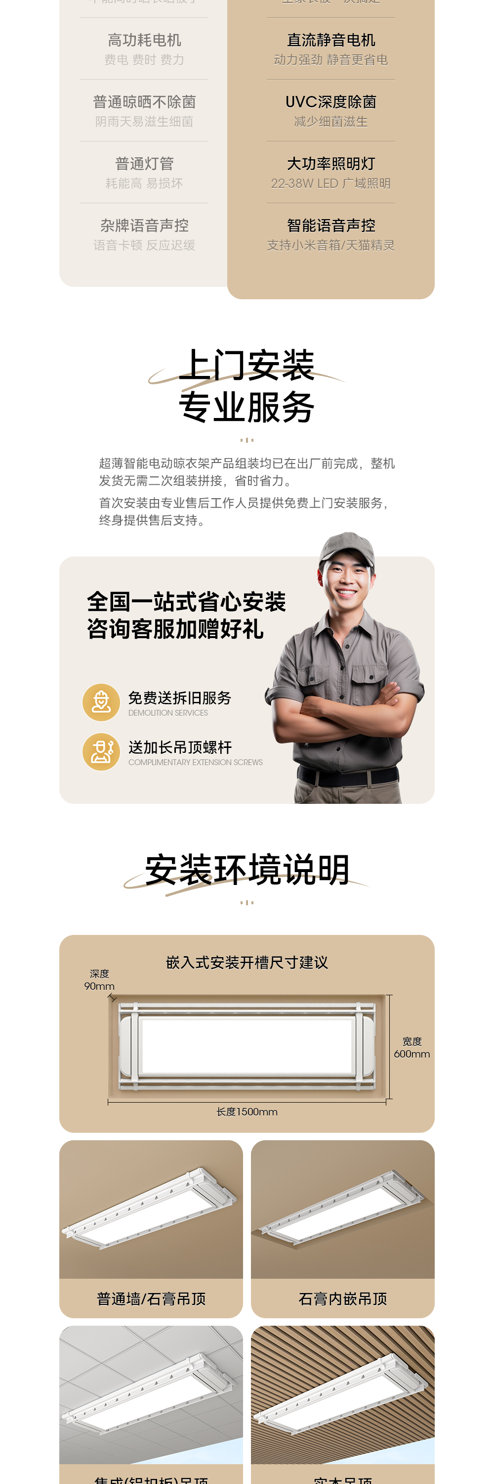 详情页中通过客厅与阳台场景的 3D 渲染图直观呈现产品安装效果,强化消费者代入感。除了各项性能的展示外,特别设置智能控制流程的 GIF 动图图解模块,兼顾专业性与生活感,让消费者对操控方式一目了然。